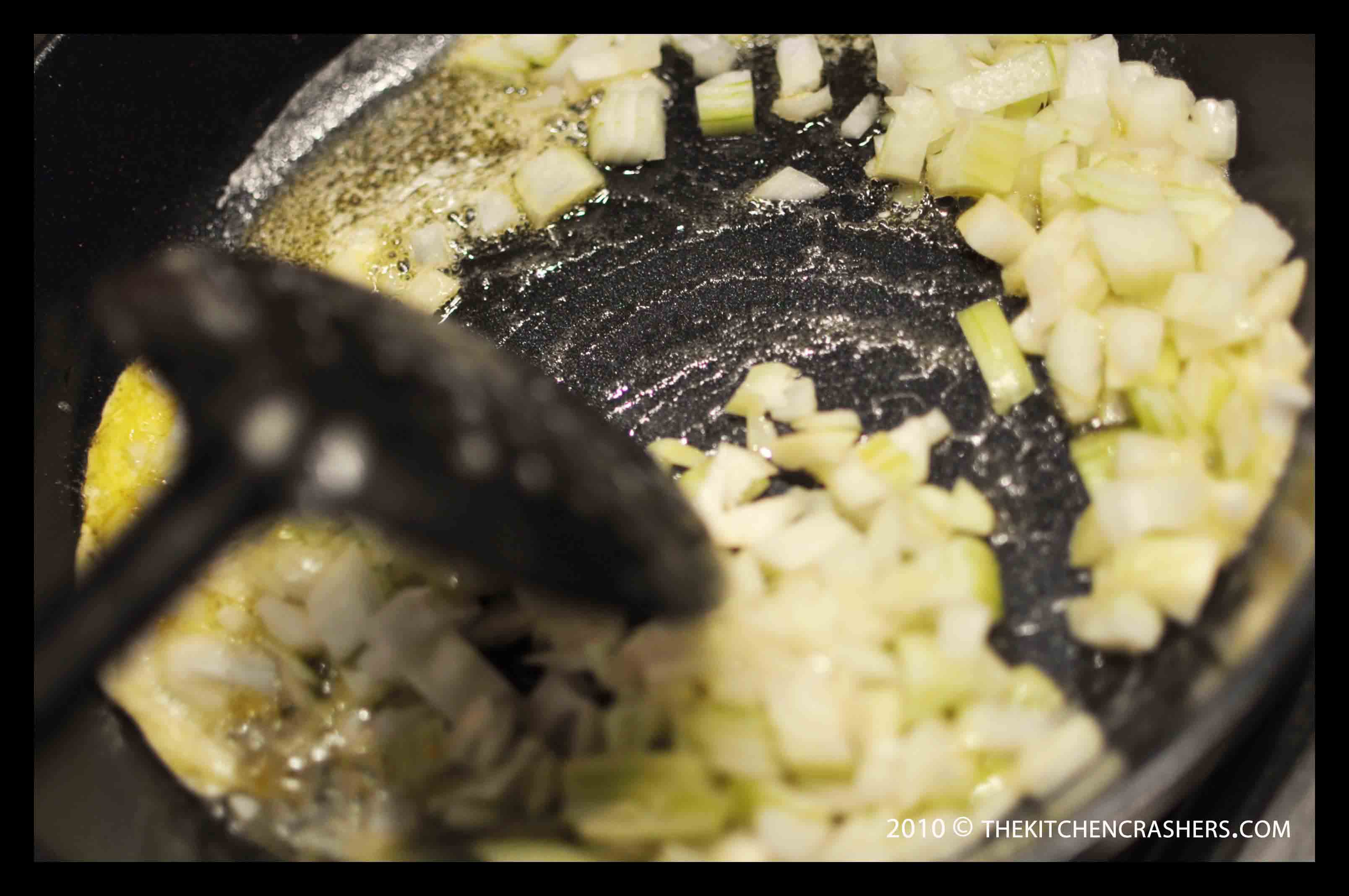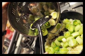 Öbür tarafta bir tavada tereyağını eritip içine soğanları atın. Soğanlar pembeleşince pırasaları keçi peynirini, muskatı, tuz ve karabiberini ekleyip 9-10dk daha bu şekilde pişirin. Ayrı bir kapta 1.5 yumurta sarısını krema ile çırpıp pırasalara ekleyin, son olarak biraz beyaz şarap katın ve karıştırın. Bir iki dakika sonra tavayı ocaktan kaldırın. 2 yumurtadan arta kalan yarım yumurta sarısını daha sonra fırına koymadan önce kullanacağız, bir kenarda saklayın.