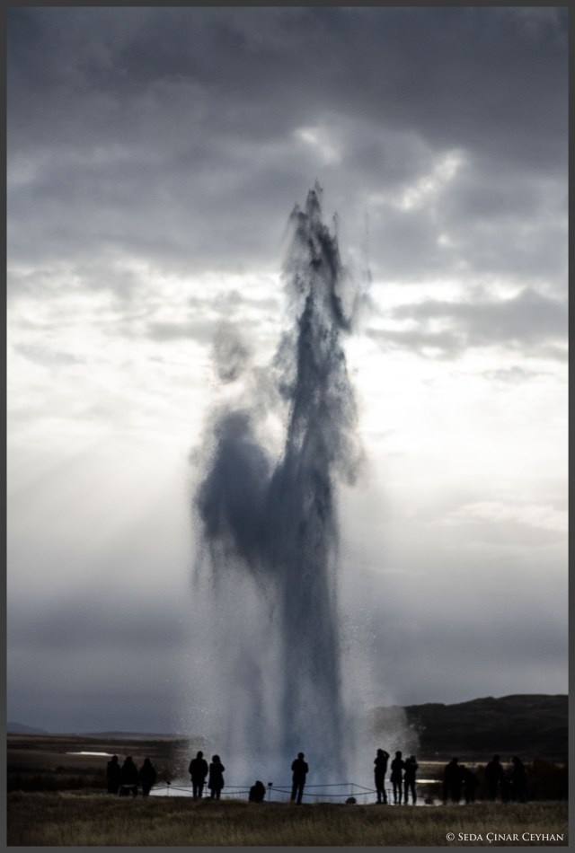 Sıradaki durağımız gayzerler diyarı Haukadalur.. Jeotermal açıdan çok aktif bu bölgede yer altı mağaralarına sıkışan sular zaman zaman yukarıya doğru fışkıran gayzerler oluşturuyor. Gayzer konseptine adına veren Geysir burada zaten! Dünyanın en yükseğe fışkıran ikinci gayzeri bu, 60-70 metreye fışkıran kaynar suları var. Ne yazık ki son yıllarda pek aktif değil ve sadece birkaç yılda bir fışkırıyor. Neyse ki dünyanın en güvenilir ve görmesi garanti gayzeri Strokkur da burada! Strokkur aşağı yukarı her beş dakikada bir 30-35 metre yüksekliğe fışkıran çok etkileyici bir gayzer. Ağzımız açık bu doğa harikasını izlemek inanılmazdı.