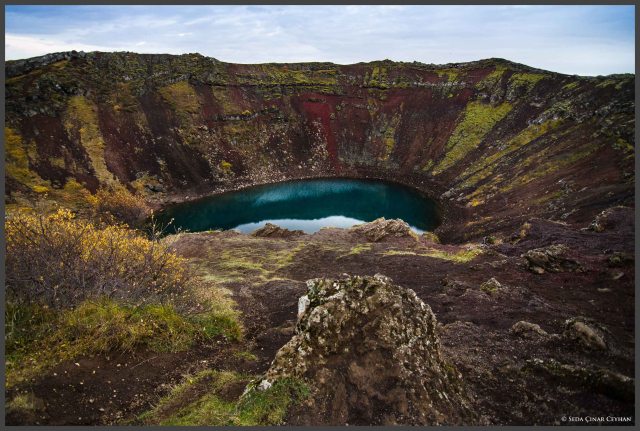 Gulfoss’u da gezdikten sonra artık epey yorulmuş ve Reykavik yoluna koyulmuştuk. Ama bir kitapta yol üzerinde bir krater gölü görme şansımız olduğunu okuyunca durmadan edemedik. Kerid krater gölü bundan 3000 yıl önce içeriye doğru göçen bir volkanik kratere su dolmasıyla oluşmuş ve harikulade güzellikte. Burada Bjork‘ün bir salın üzerinde krater gölünün etrafına toplanan bir kalabalığa bir konser verdiğini duyduk. İnanılmaz bir görüntü olsa gerek.