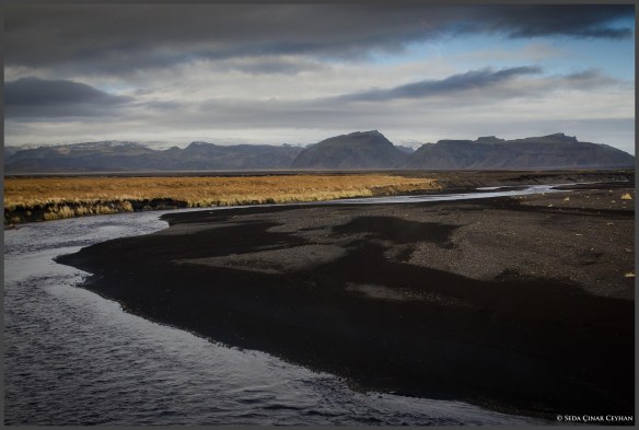 Bot turumuzdan sonra otobüsümüze geri döndük. Biz de iyice yorulmuştuk, akşam yemeğimizi yiyeceğimiz Vik‘e kadar durmak yoktu. Şansımıza Vik’e vardığımızda hava birazcık da olsa aydınlıktı. Bütün otobüs restoranın yolunu tutarken, Seda ile biz sahile ve kayalıklara doğru koşmaya başladık. Gece oluyordu, vaktimiz çok kısaydı ama hem bu doğa harikalarını yakından görmek hem de fotoğraflamak istiyorduk. Sahil çok soğuk ve rüzgarlıydı. Dev kayalardan bir dalgakıran oluşturmuşlar deniz kenarında. Kayaların üzerinde seke seke ilerledik. Tripodu kurabilecek bir düzlük arayıp birkaç resim çektik. Hava iyice karardı, birden rüzgar da şiddetini arttırdı. Yağmur da yağmaya başlayınca artık daha fazla dayanamayıp otobüse geri koştuk. Yine de kesinlikle sahile indiğimize değdi. O soğuk ve karanlıkta denizdeki bazalt kayalıklar, ve yanlızca biz ikimiz vardık sahilde, gergin bir bilim-kurgu filmin içindeydik sanki….