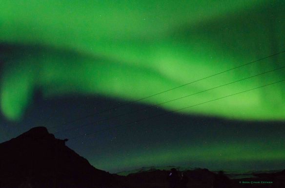 Şöförümüz zifiri karanlık yolun kenarında duracak bir yer bulup yanaştı. Kendimizi otobüsten dışarı attığımızda gördüğümüz güzellik karşısında öylece kalakaldık. Sanki yemyeşil ince bir bulut gökyüzünde dansediyordu. Tahmin ettiğimizden çok daha yoğun ve şiddetliydi doğanın bu ışık gösterisi.